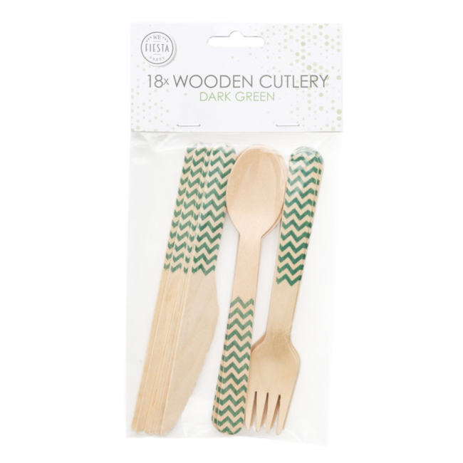 Maak je feesttafel compleet met deze duurzame houten bestekset van Fiësta. De groene zigzagprint geeft een speelse en stijlvolle uitstraling, perfect voor feestjes, picknicks en evenementen met een Westlands tintje.