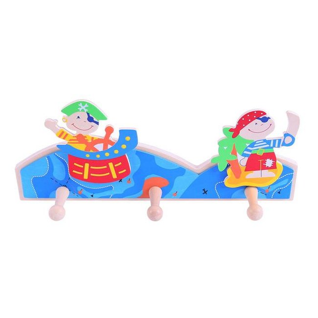 Houten kapstok van BigJigs met een vrolijk piratenthema en drie haakjes. Ideaal voor jonge avonturiers die hun spullen graag een eigen plekje geven.