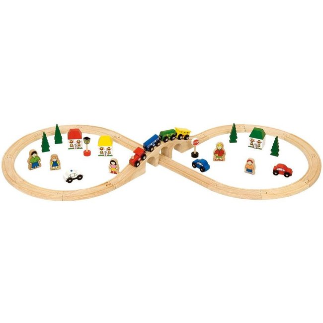 Klassieke houten treinbaanset van BigJigs in de vorm van een 8, met brug en diverse accessoires voor extra speelplezier. Perfect voor kinderen die dol zijn op treinen en fantasierijk spel.