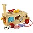 Een trekwagen met vrolijk gekleurde dieren. In de wagen zitten aan beide kanten openingen waar de dieren precies doorheen passen. Aan de achterkant van de wagen kan het hek omhoog om de dieren weer te bevrijden. Gemaakt van een mooie kwaliteit hout met een rood trekkoord. De wagen is 28 cm lang, 13 cm breed en 13 cm hoog. Inclusief 10 gekleurde houten dieren.