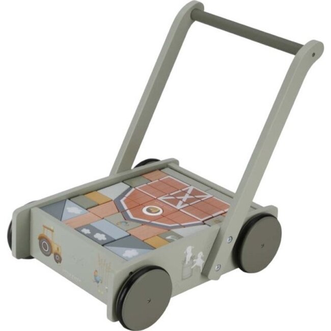 De Little Dutch Houten Blokkenkar Little Farm is een stevig loopwagentje met houten blokken voor kinderen vanaf 12 maanden, ideaal voor de eerste stapjes én de eerste bouwwerken.