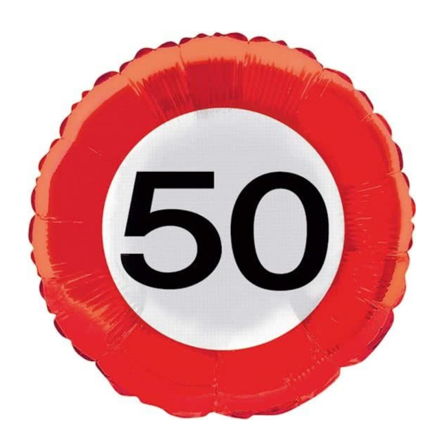 Deze opvallende folieballon in verkeersbordstijl is een klassieker voor elke 50e verjaardag. Met het grote cijfer 50 in het midden laat je in één oogopslag zien dat er iets te vieren valt.