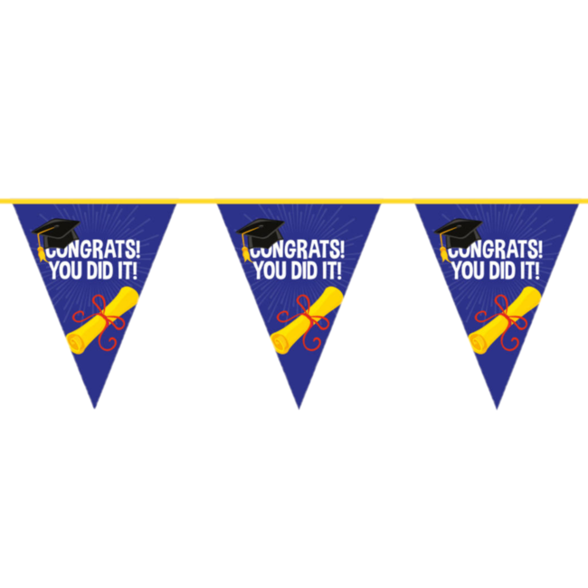 Laat iedereen zien dat je geslaagd bent met deze vrolijke vlaggenlijn van Folat van 10 meter. Met de tekst "Congrats! You Did It!", een afstudeerhoed en diploma is hij perfect om je succes te vieren.