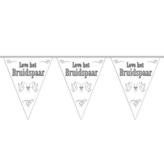 Geef een romantische sfeer aan de bruiloft of het jubileum met deze mooie vlaggenlijn van Folat van 10 meter. De vlaggetjes zijn wit en bedrukt met de tekst "Leve het Bruidspaar", samen met duiven en hartjes als symbool van liefde.