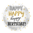 Witte ronde folieballon van 45 cm met gouden stippen en de tekst ‘Happy Happy Happy Birthday’ – een vrolijke ballon die het feestgevoel meteen versterkt.