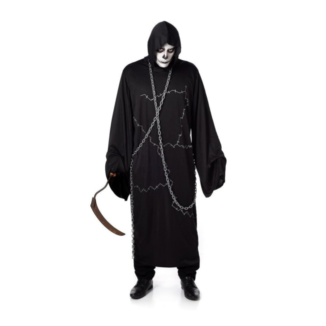 Rammelende magere Hein kostuum van het merk Partychimp voor volwassenen met maat S. Dit kostuum bevat: een mantel met capuchon en een ketting. Leuk voor ieder Halloween feest!