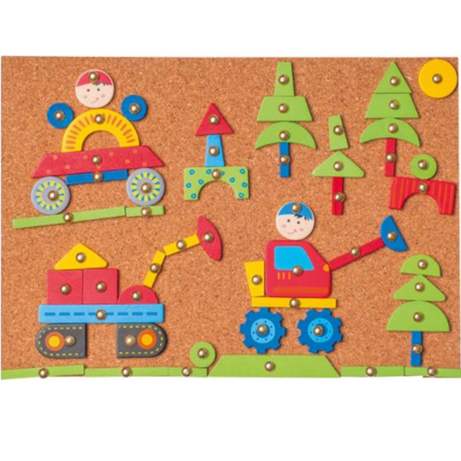 Kinderen kunnen met deze set zelf aan de slag om auto’s, kranen of hun eigen fantasiefiguren in elkaar te timmeren. Met de houten vormpjes, kleine spijkertjes en een echte hamer leren ze spelenderwijs vormen herkennen en hun creativiteit gebruiken. Alles wordt stevig vastgezet op het kurken plankje, en is steeds weer te herhalen. Ideaal voor kinderen die graag bouwen en zelf bedenken. Een leuke, leerzame activiteit voor thuis of op school.