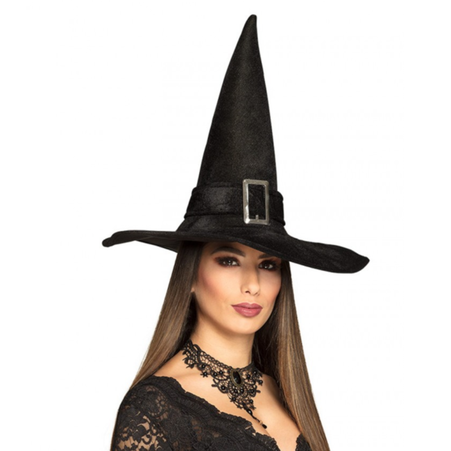 Een klassieke zwarte heksenhoed met gesp die niet mag ontbreken bij een Halloweenoutfit of een magisch verkleedmoment.