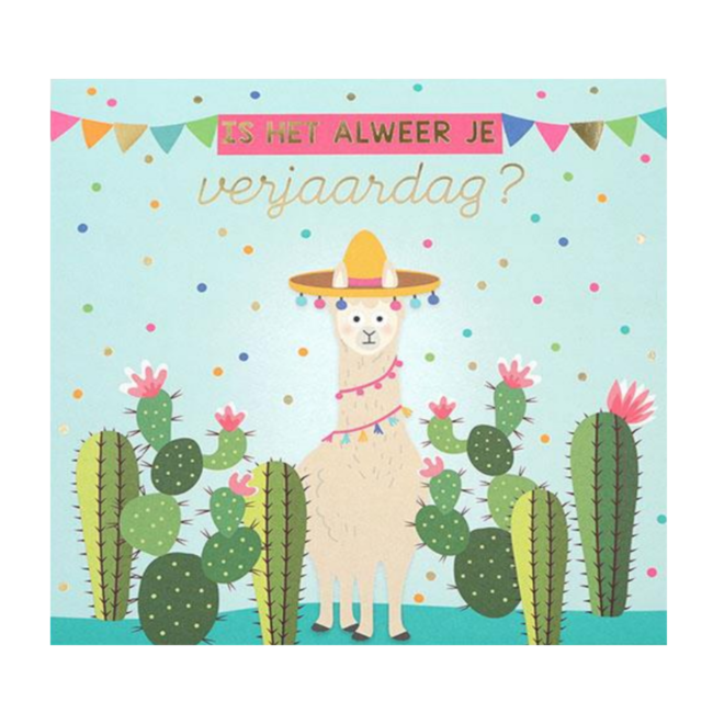 • Binnenzijde: ‘No probLAMA, geniet ervan! Happy birthday.’