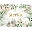 Een kleurrijke en warme condoleancekaart uit de Solace-serie, bedoeld om iemand een hart onder de riem te steken. Op de voorkant staat in sierlijke gouden letters het woord ‘Sterkte’, om te laten voelen dat je er bent.