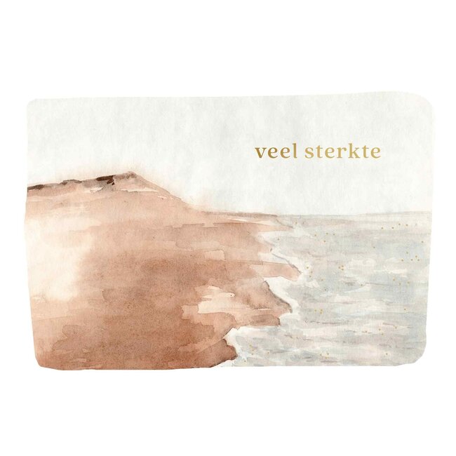 Een rustige condoleancekaart uit de Solace-serie met een aquarelillustratie van een strand en zee. Op de voorkant staat in zachte letters: ‘veel sterkte’. Een ingetogen manier om je medeleven te laten blijken.