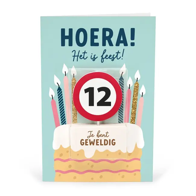 Een vrolijke verjaardagskaart voor een twaalfde verjaardag, met een origineel taartkaarsje in de vorm van een verkeersbord met het cijfer 12. Deze kaart maakt van elke verjaardag een feestje! Lees meer.