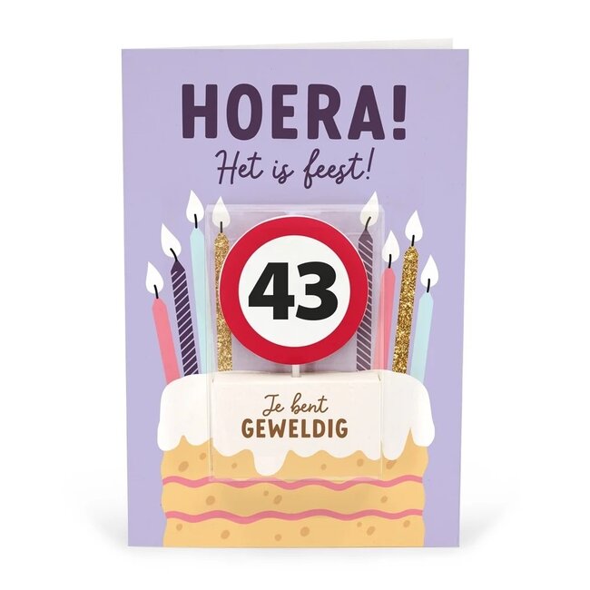 Een feestelijke verjaardagskaart met een vrolijke taart vol kaarsjes en een origineel taartkaarsje in de vorm van een verkeersbord met het cijfer 43. Ideaal voor iemand die jarig is én geweldig.