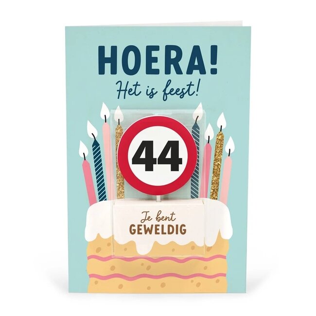 Deze kaart is ideaal voor een 44e verjaardag. Met een knipoog naar verkeersborden maakt het kaarsje het extra feestelijk. De kaart biedt ruimte voor een persoonlijke boodschap en het kaarsje steelt gegarandeerd de show op de taart. Leuk om te geven en om te krijgen!