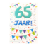 Een vrolijke en feestelijke wenskaart voor iemand die 65 jaar wordt. Met kleurrijke vlaggetjes, confetti en een opdruk vol glitters is deze kaart een perfecte verrassing voor een bijzondere verjaardag.