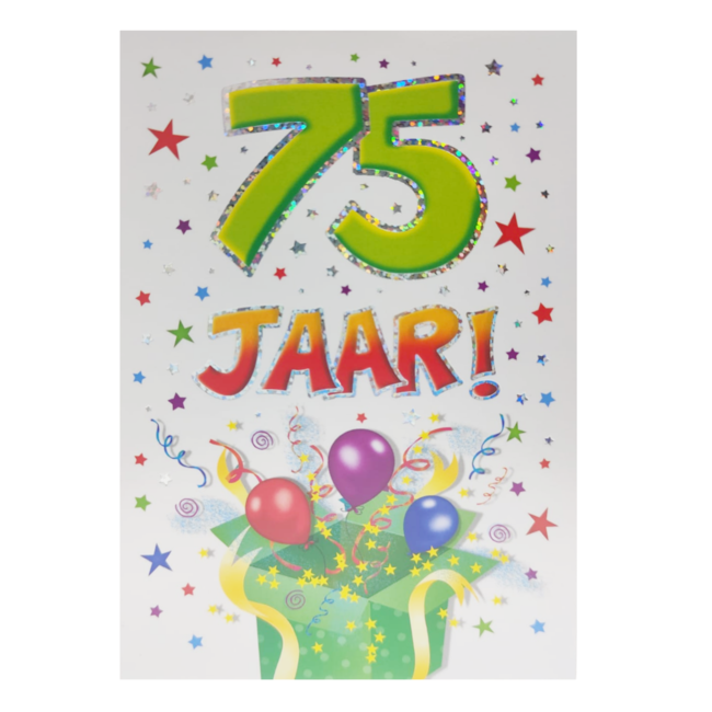 Een feestelijke wenskaart van het merk Artige met envelop, speciaal voor een 75e verjaardag. Vrolijk en kleurrijk met een knipoog naar deze bijzondere mijlpaal: driekwart eeuw jong!