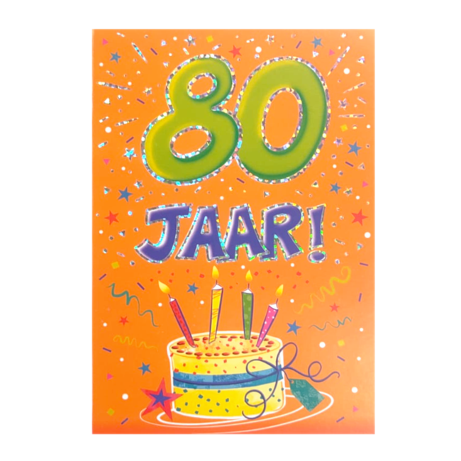 Deze kleurrijke kaart is een leuke manier om iemand van 80 te feliciteren met een flinke dosis humor en warmte. Ideaal voor een ouder, buurman, tante of goede vriend(in). Door de speelse illustraties en de hartelijke tekst wordt de kaart een klein feestje op zich. Perfect om mee te nemen of te versturen op zo’n mijlpaalverjaardag.