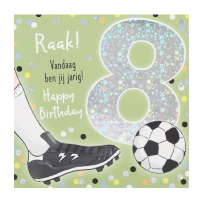 Stoere muziekkaart voor een 8-jarige voetbalfan. Met een sprankelend zilveren cijfer, voetbal en confetti is dit de perfecte kaart voor jongens die van actie en sport houden. Lees meer.