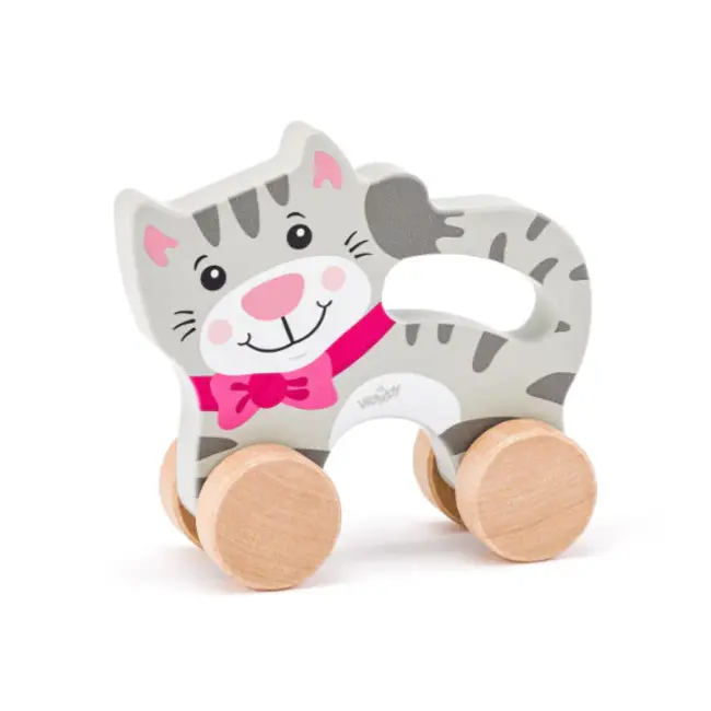 Deze houten speelgoedkat is stevig, kleurrijk en perfect afgestemd op kleine handjes. Het handvat in het midden maakt het gemakkelijk om vast te pakken en ermee rond te rijden. Dit soort speelgoed stimuleert de fijne motoriek, hand-oogcoördinatie en beweging, terwijl het tegelijkertijd zorgt voor plezier en vrolijk rollenspel. Ideaal voor ouders die op zoek zijn naar duurzaam, veilig speelgoed dat past bij de ontwikkeling van jonge kinderen. Een leuk cadeau voor peuters die gek zijn op dieren én op alles wat rolt.