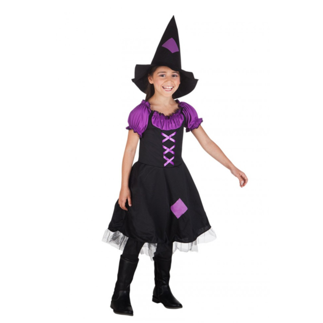 Een heerlijk heksenkostuum voor jonge kinderen die graag in de huid van een toverheks kruipen. Deze zwart-paarse outfit is perfect voor Halloween of een verkleedmiddag thuis en is geschikt voor kinderen van 7 t/m 9 jaar.