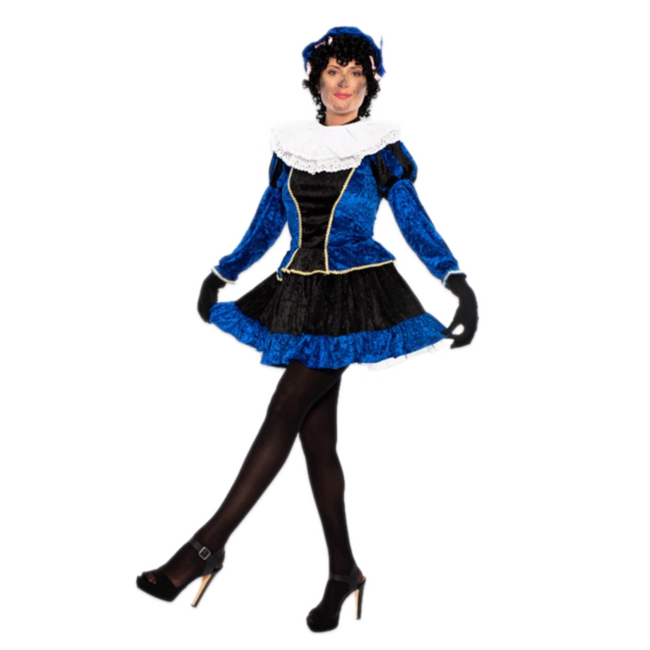 Een klassiek pietenkostuum voor volwassenen in maat S, uitgevoerd in blauw met zwart velours. Deze feestelijke set van Witbaard is ideaal voor optredens, intochten of sinterklaasactiviteiten.