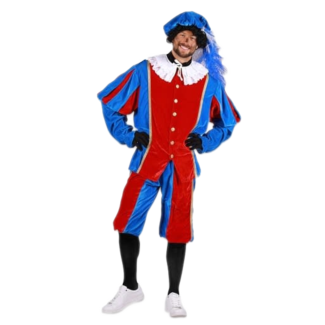 Pietenkostuum voor volwassenen in rood met blauw polyesterfluweel, met klassieke uitstraling. Geschikt voor sinterklaasoptredens, intochten en feestelijkheden. Lees meer.