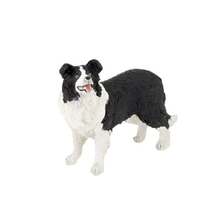 De border collie van Papo is een gedetailleerd speelfiguur dat de levendigheid en intelligentie van dit populaire hondenras prachtig weergeeft. Met zijn zwart-witte vacht en alerte houding lijkt hij klaar om te spelen of te werken op de boerderij.