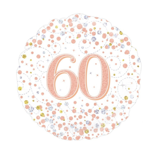 Deze elegante folieballon in roségoud en glinsterende accenten is een stijlvolle verrassing voor een 60e verjaardag. De sierlijke details en feestelijke glans zorgen meteen voor een warme, feestelijke sfeer.