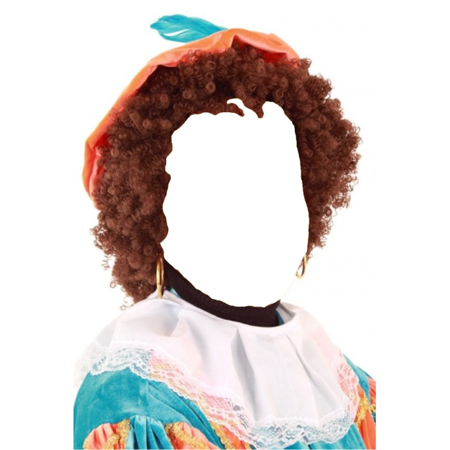 Bruine pietenpruik met korte, strakke krullen en een verstelbare kap voor goede pasvorm. Geschikt voor volwassenen en herbruikbaar bij intochten of optredens. Lees meer.