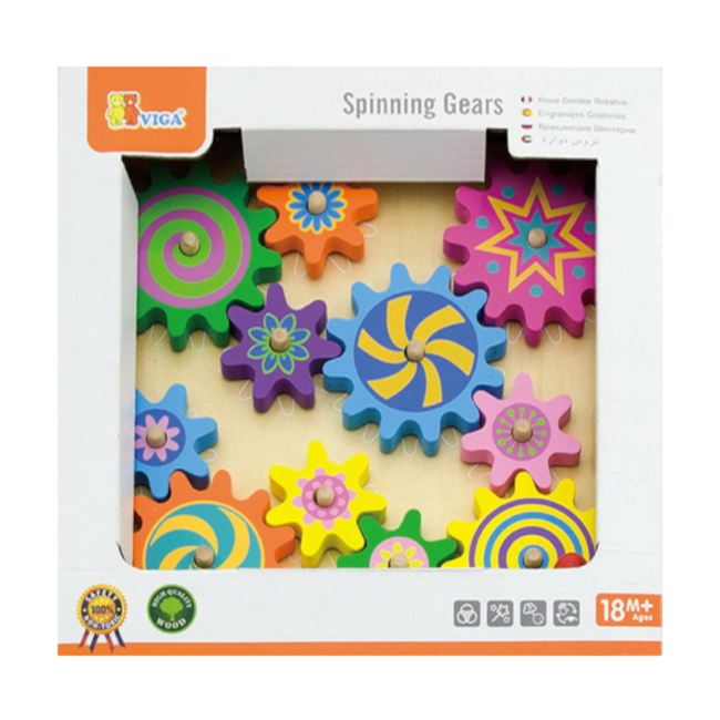 Deze kleurrijke houten tandwielenpuzzel van Viga is perfect voor kleine ontdekkers die graag spelenderwijs leren! De set bevat 11 tandwielen in twee verschillende maten, die op de juiste plek gelegd moeten worden om een kettingreactie te creëren. Wanneer aan het grote gele tandwiel wordt gedraaid, bewegen alle tandwielen in tegengestelde richtingen, wat zorgt voor een fascinerend en leerzaam effect.