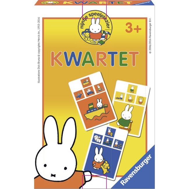 Ravensburger Nijntje Kwartet is het vrolijke kaartspel speciaal voor kleuters. Verzamel setjes van vier bij elkaar horende kaarten met Nijntje en haar vriendjes en win het spel. Perfect voor de allerkleinsten, ook zonder leesvaardigheid te spelen! Lees meer.