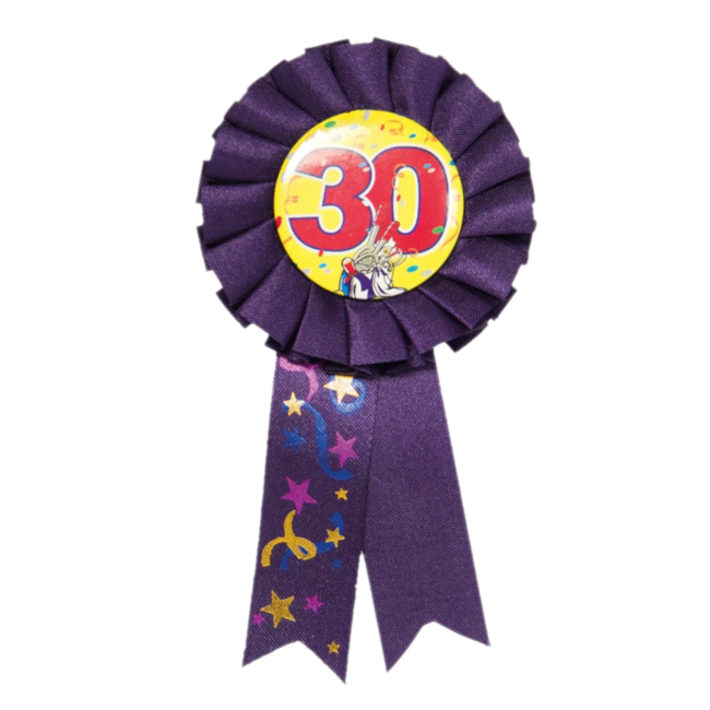 Met deze vrolijke rozet van Folat wordt een 30e verjaardag extra feestelijk gevierd. De paarse linten, kleurrijke sterren en de opvallende button met ‘30’ maken duidelijk dat er een bijzondere mijlpaal is bereikt.