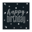 16 Zwarte, zilveren servetten met de tekst: 'happy birthday' erop afgebeeld. De servetten zijn 33 x 33 cm groot.