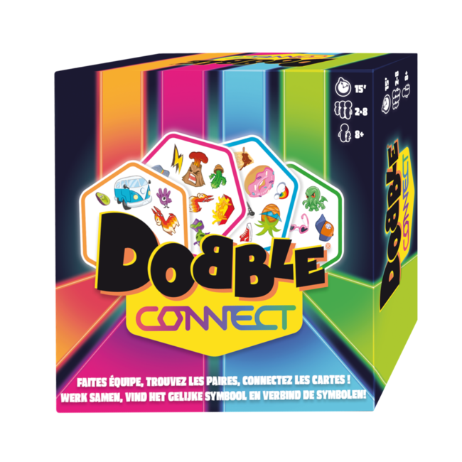 Dobble Connect is de nieuwe, tactische variant van het populaire Dobble-spel. Nu met zeshoekige kaarten en maar liefst 10 symbolen per kaart! Vind razendsnel het gemeenschappelijke symbool en leg kaarten aan om met je team 4 op een rij te maken.