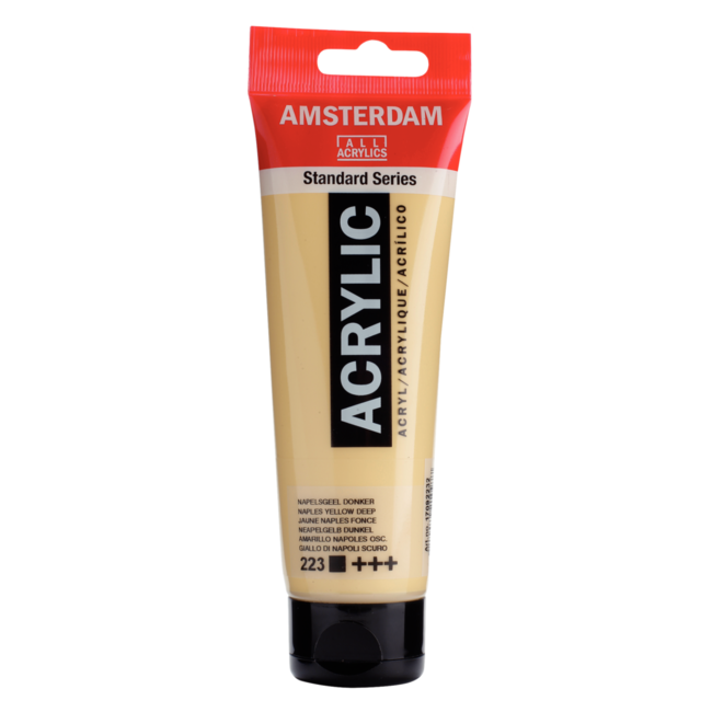 Met Amsterdam Acrylverf 223 Napelsgeel Donker 120 ml werk je met een warme, diepe geeltint die dekkend is en ideaal voor natuurlijke schaduwen en klassieke nuances. De verf droogt snel, is geurloos, flexibel en blijft minimaal 100 jaar lichtecht.