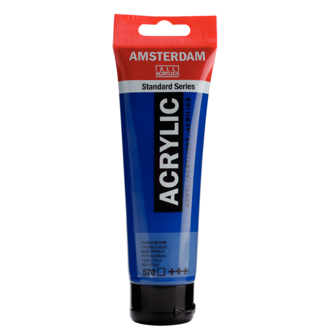 Met Amsterdam Acrylverf 570 Phtaloblauw 120 ml werk je met een krachtige, transparante blauwtint die rijk en intens oogt. De verf droogt snel, is geurloos, flexibel en blijft minimaal 100 jaar lichtecht.
