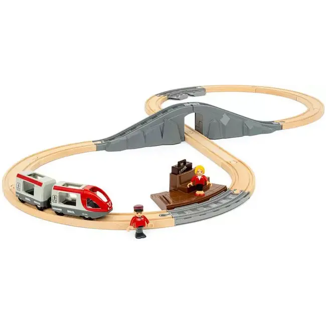 Leuke Brio startset met reistrein, perfect om kennis te maken met de wereld van BRIO World. Deze set heeft een spoorbaan in een 8-vorm met een brug en passagiersperron voor nog meer speelplezier.